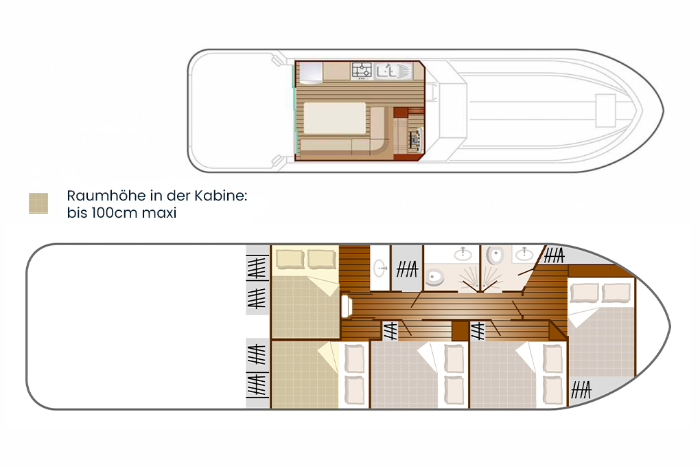 Die Ausstattung an Bord variiert je nach Schiffstyp. Es ist daher ratsam, sich auf der jeweiligen Schiffsseite über die spezifische Ausstattung zu informieren. Im Allgemeinen finden Sie an Bord immer Einrichtungen für Ihren Komfort wie einen geräumigen Salon, eine voll ausgestattete Küche, Kabinen mit Stauraum, Heizung und sanitäre Einrichtungen. Einige Modelle bieten darüber hinaus zusätzliche Annehmlichkeiten wie eine zweite Terrasse auf dem Sonnendeck oder eine Klimaanlage. Wir sorgen dafür, dass jedes Boot Ihren Bedürfnissen entspricht, damit Sie eine angenehme Reise erleben.